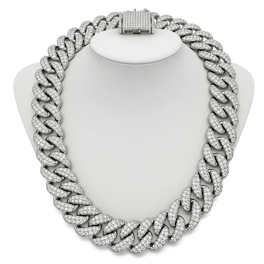 This formidable Cuban link necklace redefines masculine luxury, meticulously crafted in 18KT white gold. Each substantial link is completely covered in micro-set VVS brilliant diamonds, creating an unstoppable flow of light and brilliance. Engineered for enduring wear and bold presence, this piece utilizes a robust box clasp for ultimate security. It serves as the definitive statement of power and impeccable taste, designed for the discerning wearer.