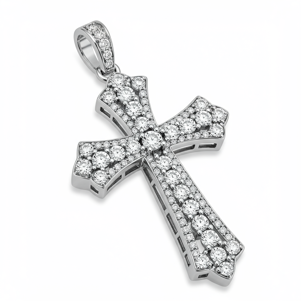This elegant cross pendant, crafted from lustrous Sterling Silver, offers a timeless symbol of faith and devotion. Thirty brilliant round diamonds are meticulously pave-set across the arms of the cross, catching the light with exceptional sparkle. The rhodium-plated finish ensures enduring brilliance and resistance to tarnish, making this piece perfect for daily wear. Its classic design allows it to be paired effortlessly with any chain, making it a meaningful addition to any fine jewelry collection.