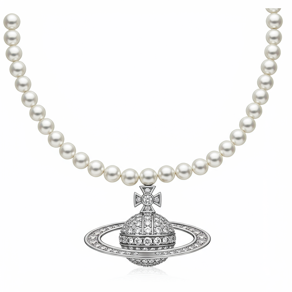 The Vivienne Westwood Pearl Necklace embodies rebellious elegance, pairing classic pearls with iconic British punk aesthetics. This striking choker features lustrous freshwater pearls meticulously strung, culminating in a detailed, crystal-set Saturn Orb pendant. Crafted in 18KT white gold, the fine metalwork provides a secure and luxurious foundation for the stones and pearls. It is the definitive statement piece, transitioning seamlessly from couture fashion runway to everyday high style.