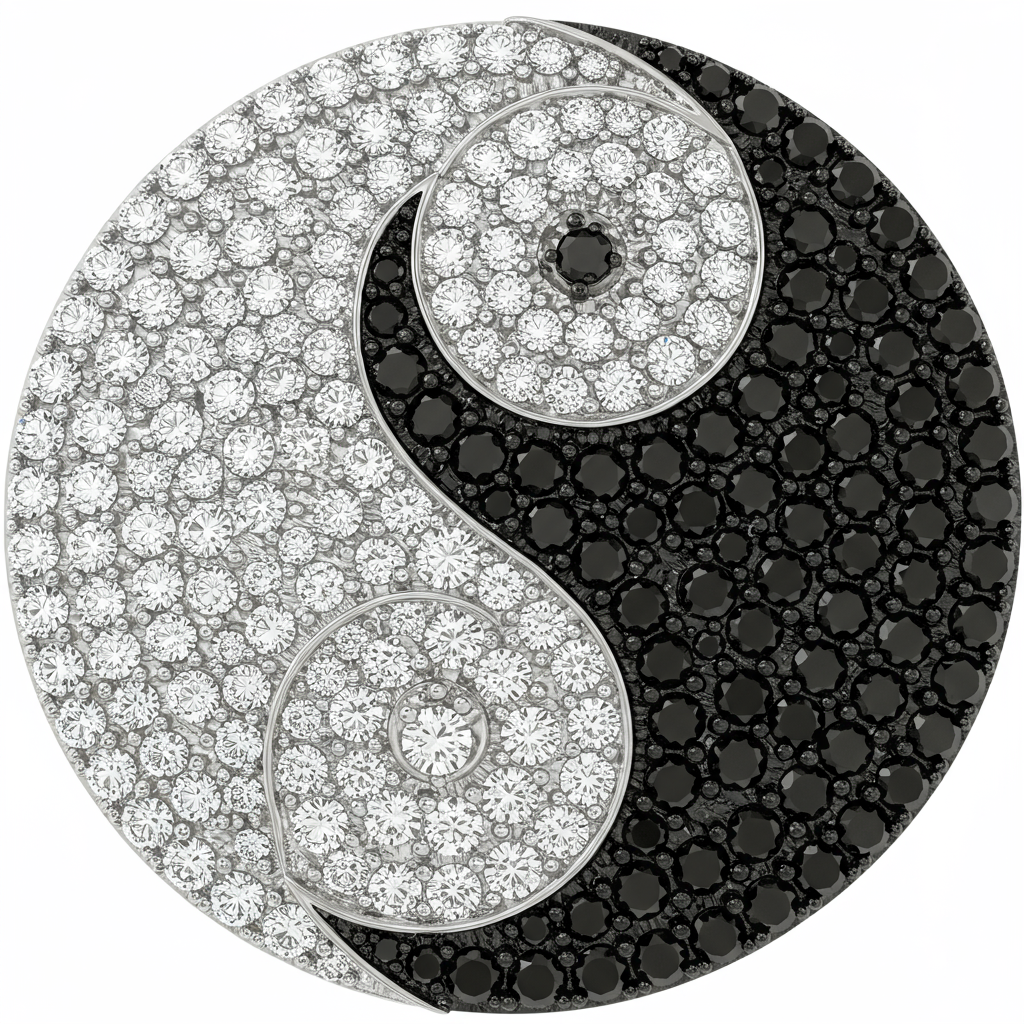 The Yin Yang Necklace captures the eternal balance of the universe, symbolized by flawless pave settings within a sophisticated circular design. Crafted in luxurious 18KT white gold, this pendant features a meticulous split design where brilliant colorless diamonds meet striking treated black diamonds. This piece represents harmony, duality, and the perfect unity of opposing forces, making it a profound and sophisticated statement accessory for daily wear.