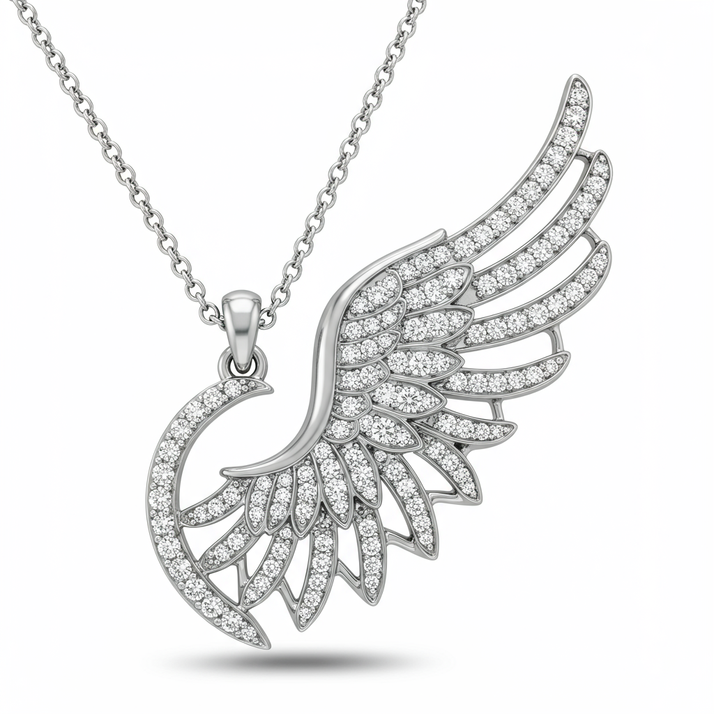 The Angel Wing Necklace captures ethereal beauty and grace, representing freedom and guidance. Crafted in lustrous 18KT white gold, the delicate wing silhouette is entirely paved with brilliant round diamonds. This stunning piece rests elegantly near the heart, offering a sophisticated statement of luxury. It is the perfect choice for commemorating cherished milestones or elevating daily wear with celestial sparkle.