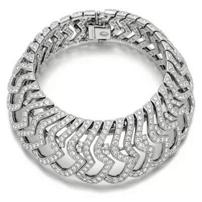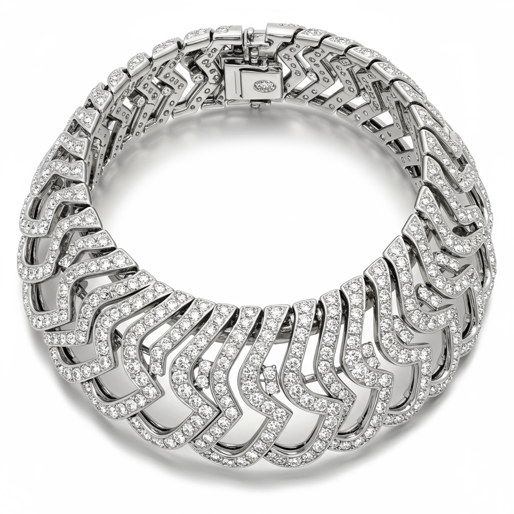 The Bulgari Necklace embodies timeless Roman elegance, featuring a bold, interlocking geometric design crafted in luminous 18KT white gold. This magnificent collar piece is meticulously set with hundreds of brilliant round diamonds, showcasing exceptional fire and brilliance. Its flexible structure drapes seamlessly around the neck, defining luxury and making a profound statement of sophistication. This heirloom-quality piece is designed for the grandest occasions, ensuring its wearer stands out with unparalleled glamour.