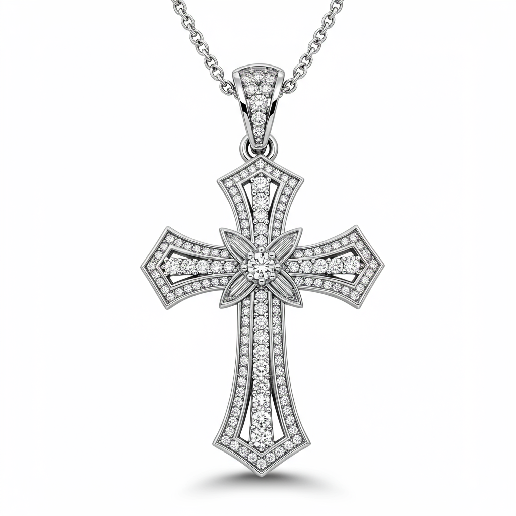 Embrace the intersection of rebellious style and high-end luxury with the Chrome Hearts Cross Necklace. This iconic pendant features a dense micro-pave setting, meticulously filled with brilliant VVS diamonds that capture light from every angle. Crafted in substantial 18KT white gold, the design balances edgy aesthetics with flawless craftsmanship. It stands as a powerful statement piece, offering a sophisticated edge to any ensemble.