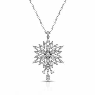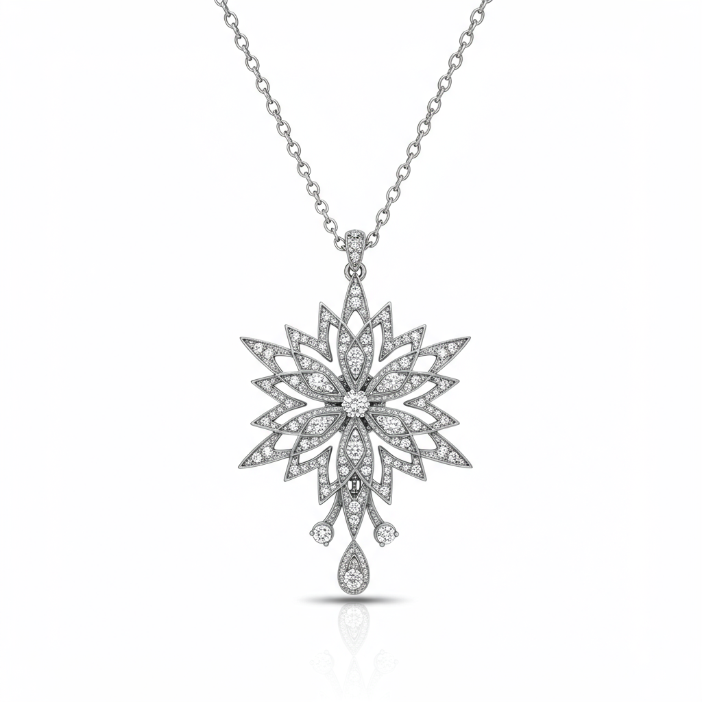 The Evenstar Necklace captures ethereal beauty with its delicate, intricate design. Crafted in luminous 18KT white gold, this elegant drop pendant features a cascade of high-quality pavé set diamonds that shimmer exquisitely. Its flowing, symmetrical form evokes romance and timeless grace, making it a perfect heirloom piece for significant occasions. This masterpiece is designed to catch the light from every angle, ensuring a breathtaking sparkle and luxurious appearance.