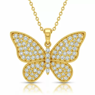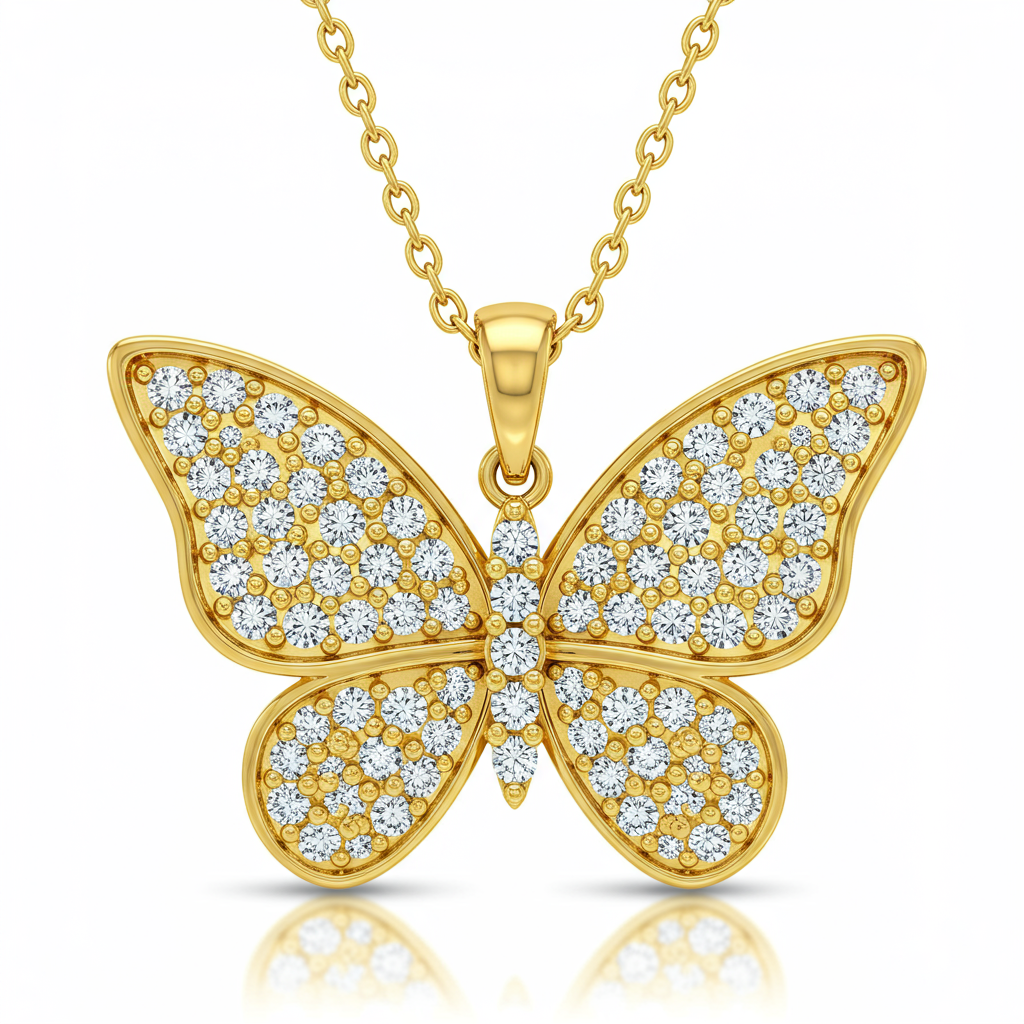Embrace the beauty of nature with this exquisite Gold Butterfly Necklace, a testament to delicate craftsmanship. Forged in radiant 18KT yellow gold, the pendant features a stylized butterfly design symbolizing grace and transformation. Its wings are meticulously set with VVS round brilliant diamonds in a shimmering pave, catching the light with every movement. This timeless piece hangs from a slender gold chain, making it the perfect sophisticated accessory for any occasion.