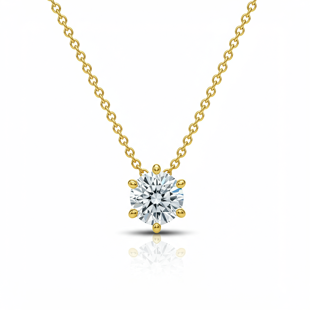 The Gold Tiffany Necklace embodies timeless elegance with its iconic six-prong setting. This exquisite solitaire pendant cradles a brilliant round diamond, maximizing light return and intense scintillation. Crafted in lustrous 18KT yellow gold, the delicate cable chain complements the central VVS stone perfectly. It is a quintessential piece, symbolizing sophistication and enduring style, suitable for both everyday wear and monumental occasions.