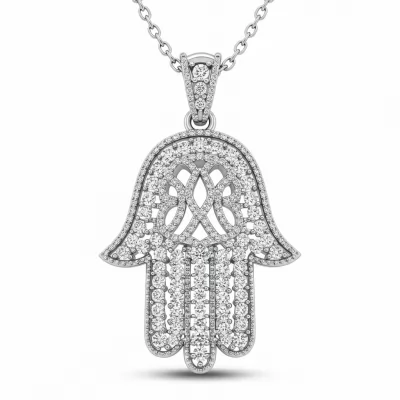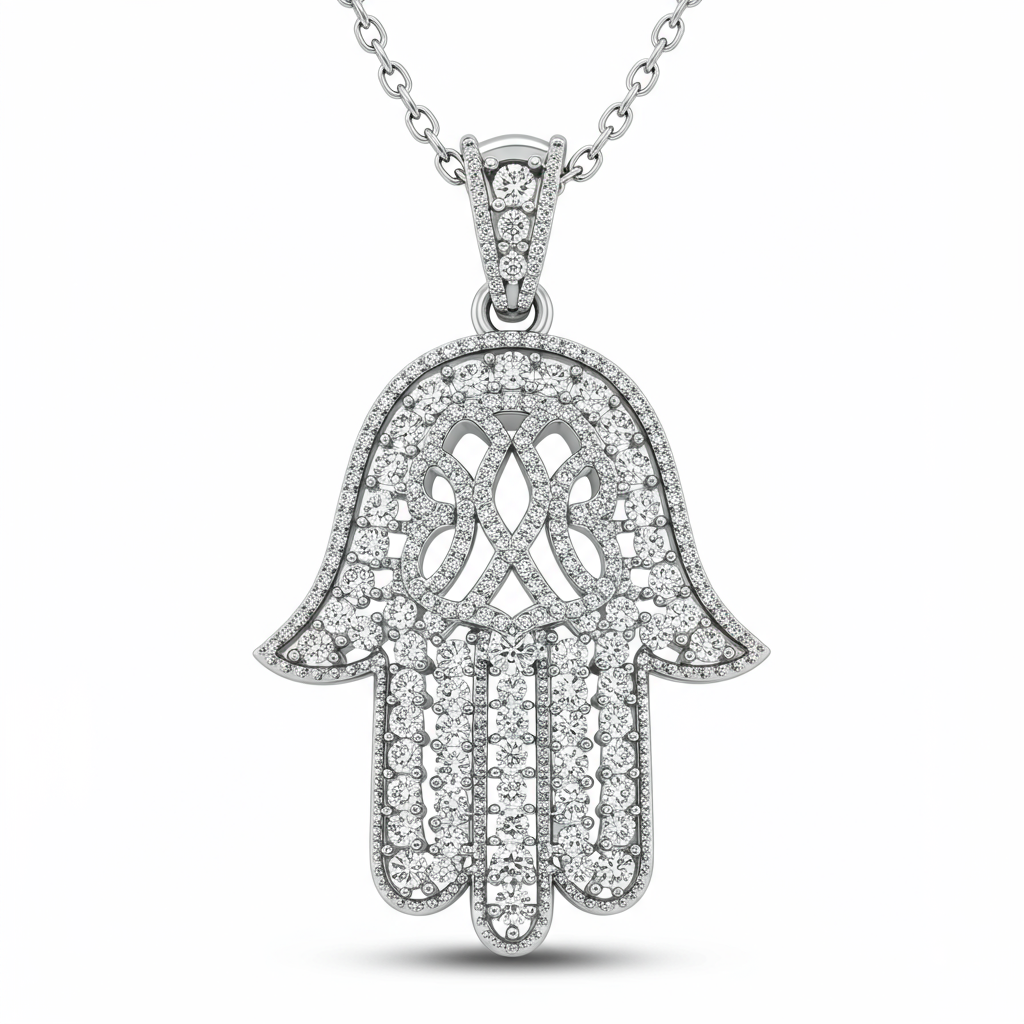 The Hamsa Hand Necklace offers a modern interpretation of an ancient symbol of protection and good fortune. Crafted in lustrous 18KT white gold, the delicate hand silhouette is entirely covered in brilliant micro-pave-set diamonds. This timeless piece features exceptional VVS clarity stones, ensuring maximum sparkle and brilliance from every angle. Suspended from a slender adjustable chain, this necklace is designed to be a cherished, sophisticated daily talisman.