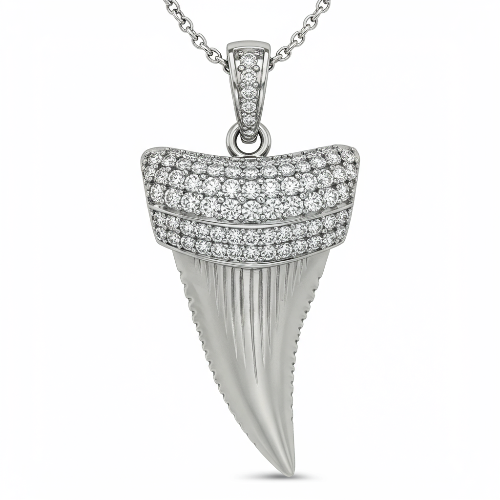 This striking necklace captures primal power and luxury, centered around a stylized Megalodon tooth motif. Crafted in brilliant 18KT white gold, the ancient form is modernized with meticulous pave settings along the custom bail and upper contours. The brilliant VVS diamonds enhance the fierce, sharp edges, creating a statement piece that is both historical and contemporary. This pendant hangs from a finely articulated chain, symbolizing strength and enduring elegance for the wearer.