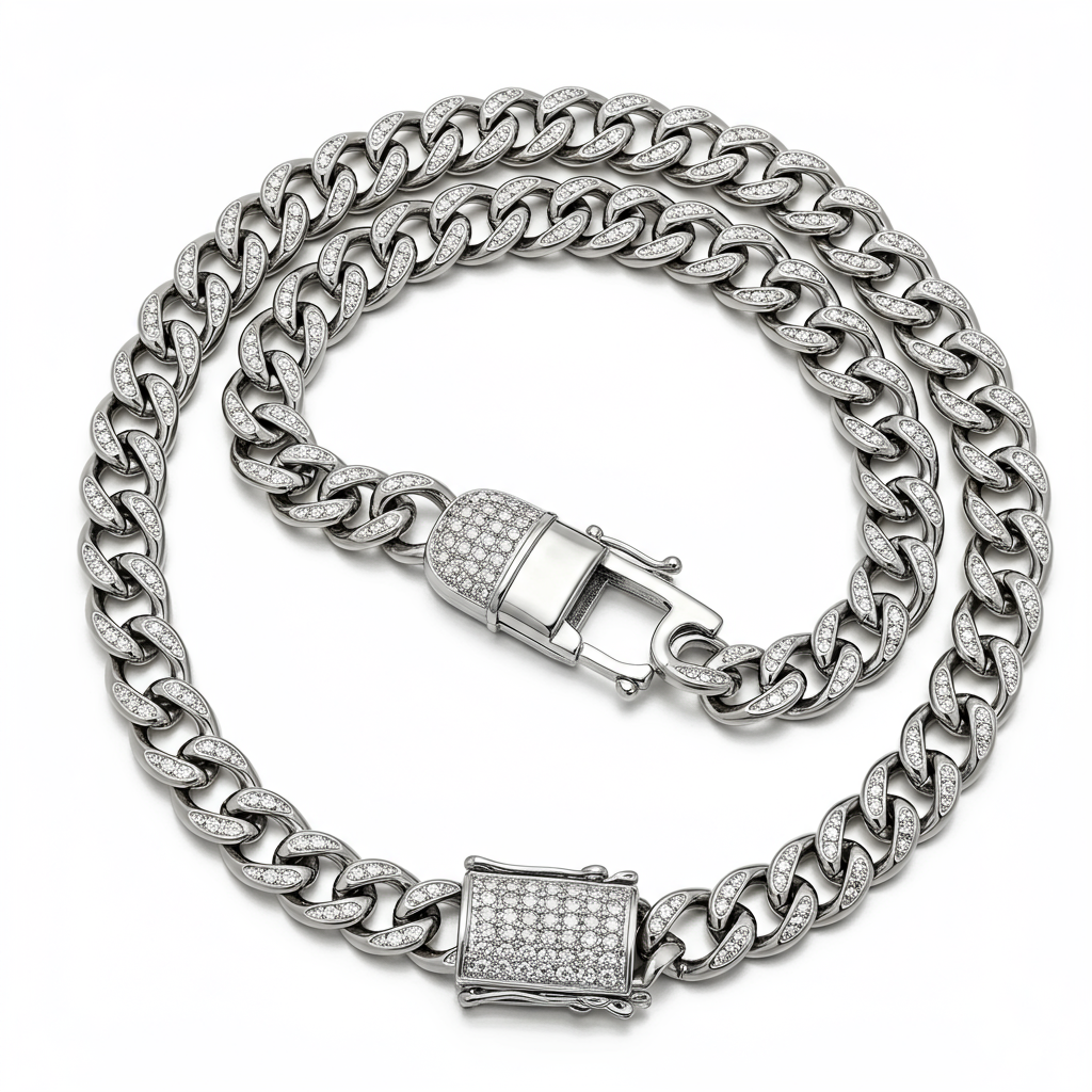 This commanding Mens Silver Necklace is meticulously crafted from premium Sterling Silver, featuring substantial curb links for a masculine profile. The clasp mechanism is exquisitely pave-set with high-clarity diamonds, adding a discreet yet undeniable element of luxury. Designed for the modern gentleman, this piece offers a perfect balance of robustness and sophisticated elegance. Its flawless polish ensures maximum shine and enduring appeal, making it a staple accessory.
