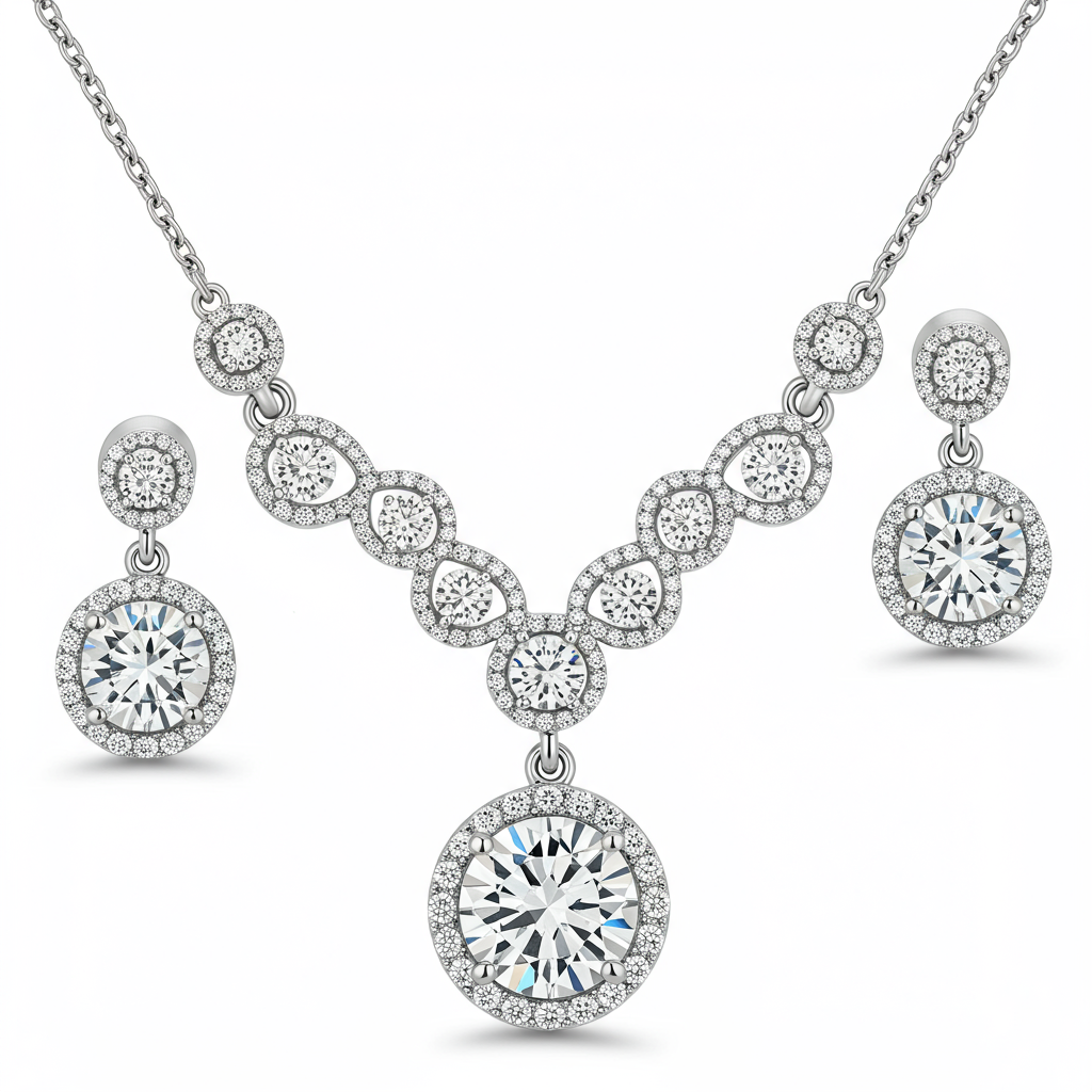 This exquisite Necklace and Earring Set defines opulent elegance, crafted meticulously in 18KT white gold. It features a harmonious design where the pendant and matching drop earrings showcase brilliant round diamonds at their center. Each piece is encircled by a dazzling halo of smaller, perfectly aligned VVS accent diamonds, maximizing sparkle and brilliance. This timeless ensemble is the ultimate statement of luxury, designed to illuminate any grand occasion with unmatched sophistication and grace.