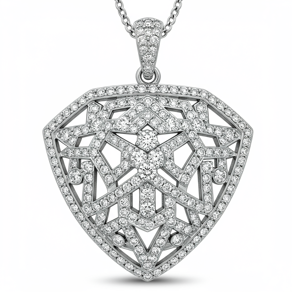 The Necklace Mens Pendant is a bold statement piece crafted for the modern gentleman. It features 18KT white gold sculpted into a contemporary geometric design, fully embellished with brilliant VVS round diamonds. The substantial weight and impeccable craftsmanship reflect enduring luxury. This pendant seamlessly combines high fashion with classic sophistication, making it the perfect accessory for both formal and casual settings.