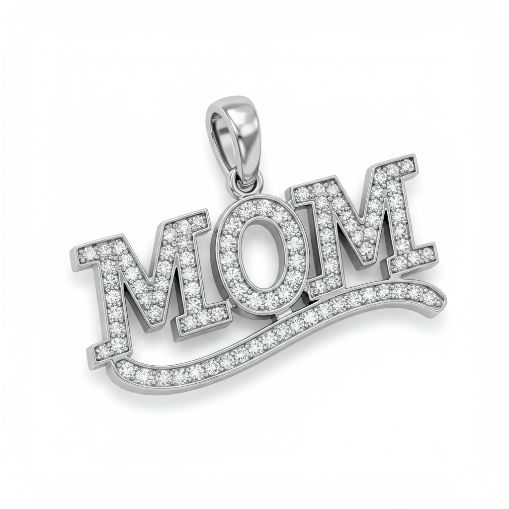 This luxurious pendant beautifully captures the essence of maternal love in shimmering 18KT white gold. The script spelling 'MOM' is meticulously set with a pave of VVS quality diamonds, ensuring exceptional sparkle and brilliance. It is a sophisticated and heartfelt piece designed to be cherished as a timeless symbol of gratitude. The delicate chain ensures the pendant rests perfectly, making it ideal for daily wear or special occasions.
