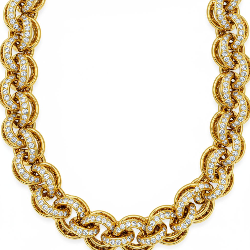 The Rope Necklace is a commanding piece of luxury, designed with exceptional fluidity and brilliance. Expertly crafted in 18KT yellow gold, its twisted links are entirely adorned with hundreds of high-clarity diamonds, creating an unbroken line of fire. This statement necklace offers an unparalleled drape and magnificent sparkle, perfect for marking life's most significant achievements. It represents the pinnacle of craftsmanship and enduring style.