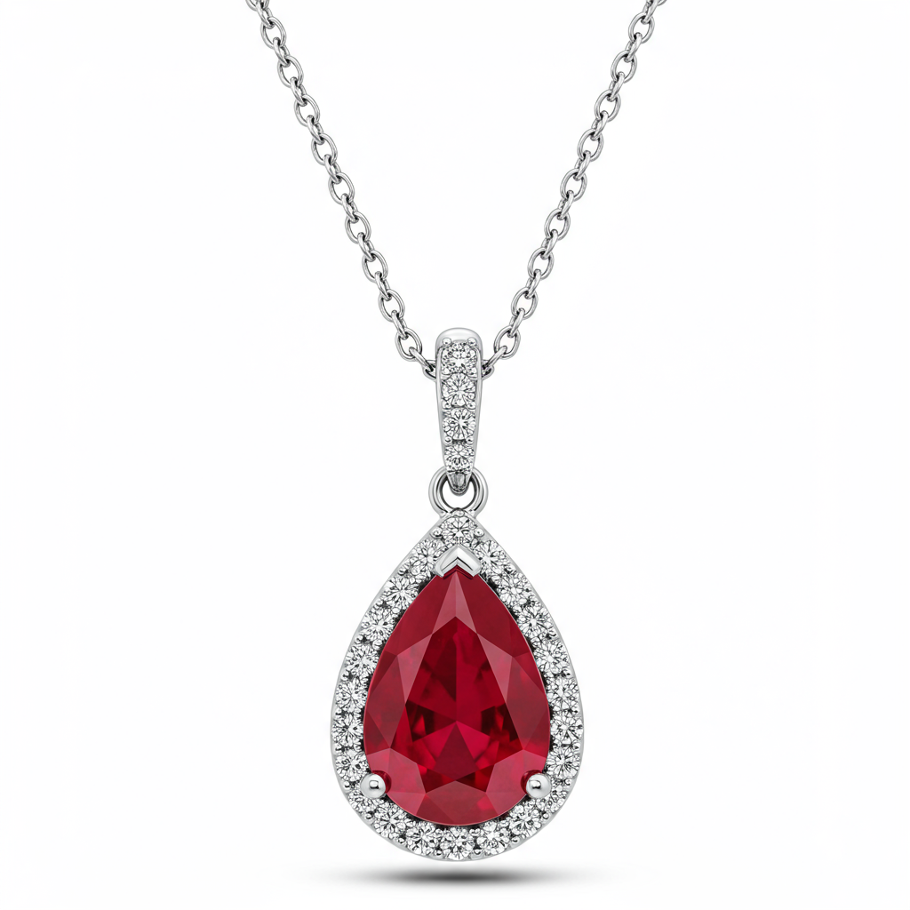 This exquisite necklace features a vibrant, pear-shaped natural Ruby centerpiece, symbolizing passion and vitality. The central stone is surrounded by a delicate halo of micropavé set round diamonds, enhancing its fiery hue. Crafted meticulously in 18KT white gold, the design balances timeless elegance with modern sophistication. This piece is suspended from a finely crafted chain, ensuring the perfect drape against the collarbone. It is an heirloom piece destined to elevate any formal attire.
