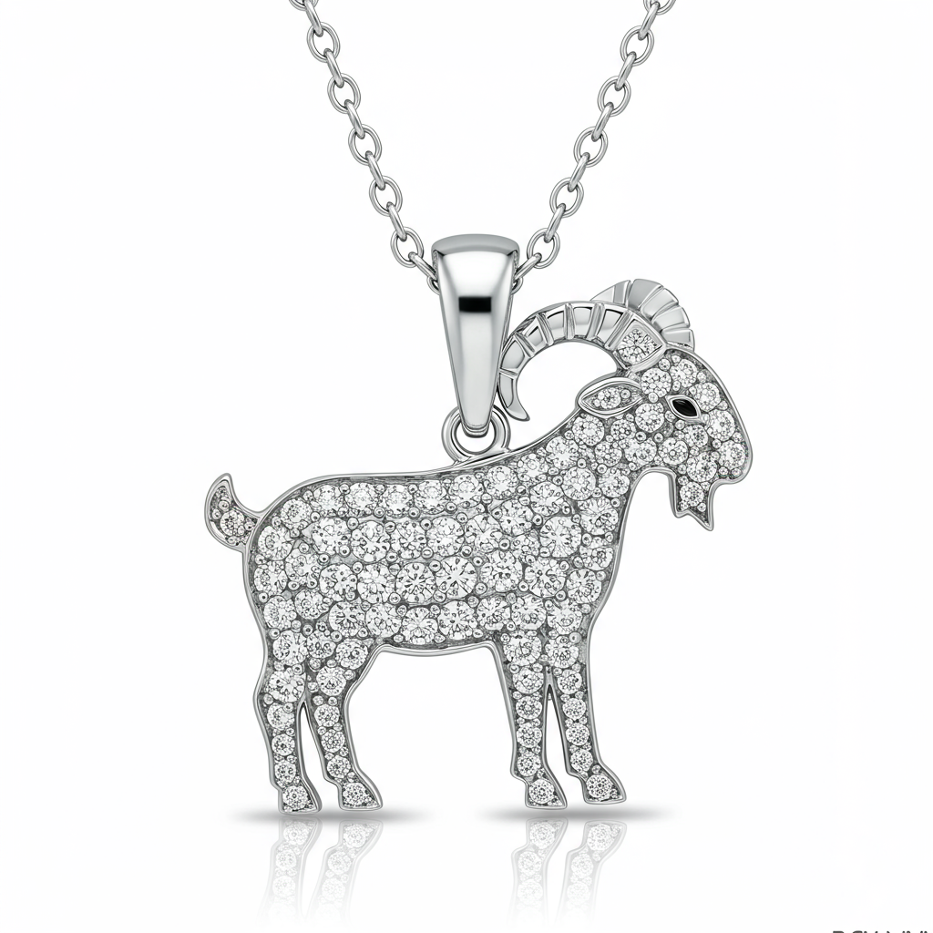 The 'Goat Necklace' pays homage to athletic excellence and enduring spirit, beautifully captured in 18K white gold. This iconic pendant is meticulously crafted, featuring a stylized goat silhouette fully paved with brilliant-cut VVS diamonds. Suspended from a delicate yet durable chain, the piece symbolizes dedication and unparalleled achievement in any field. It is a stunning, meaningful statement accessory designed for the truly exceptional individual who strives to be the Greatest of All Time.