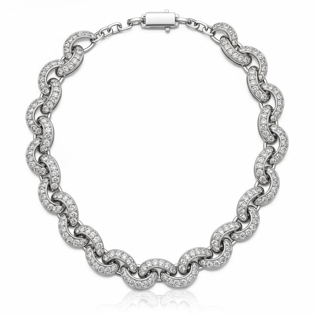 The Stitch Necklace embodies contemporary elegance through its interwoven structure and brilliant diamond accents. Crafted in luxurious 18KT white gold, this piece features a dynamic, segmented design that catches light from every angle. Each segment is meticulously pave-set with high-quality round brilliant diamonds, creating a continuous flow of sparkle. This striking pendant is perfect for the modern sophisticate seeking a signature piece that transitions seamlessly from daywear to evening glamour.
