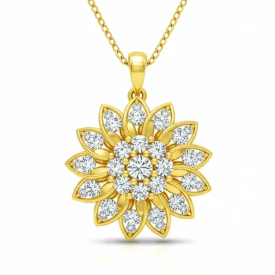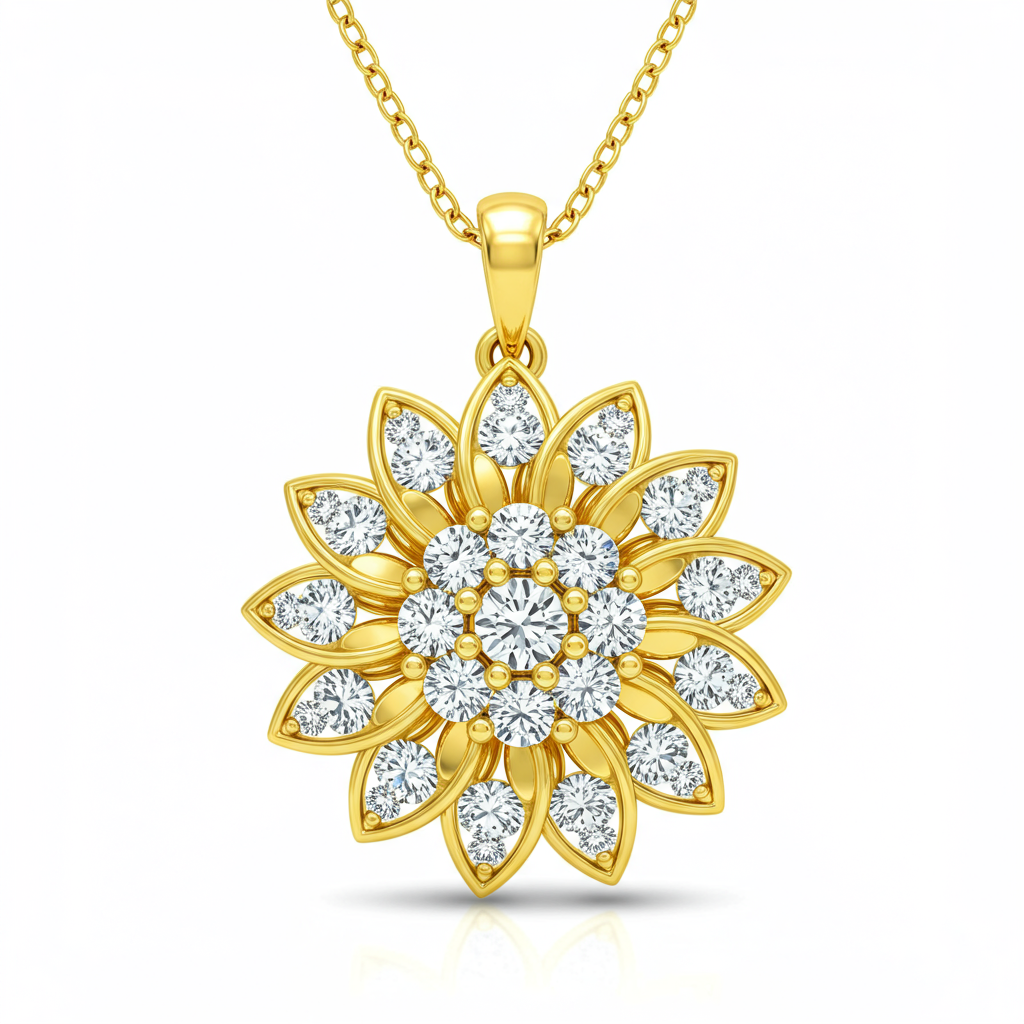 The Sunflower Necklace captures the joy and radiance of nature's most cheerful bloom. Expertly crafted in 18KT yellow gold, this pendant features a meticulously detailed petal design forming a brilliant diamond halo around a stunning central stone. The combination of the high-carat center diamond and surrounding micropavé diamonds maximizes sparkle and depth. This exquisite piece symbolizes light, vitality, and enduring grace, suspended from a delicate yet strong matching chain, making it an instant heirloom.