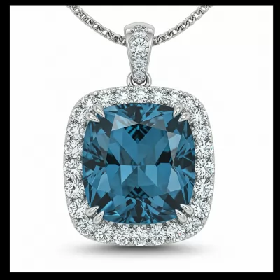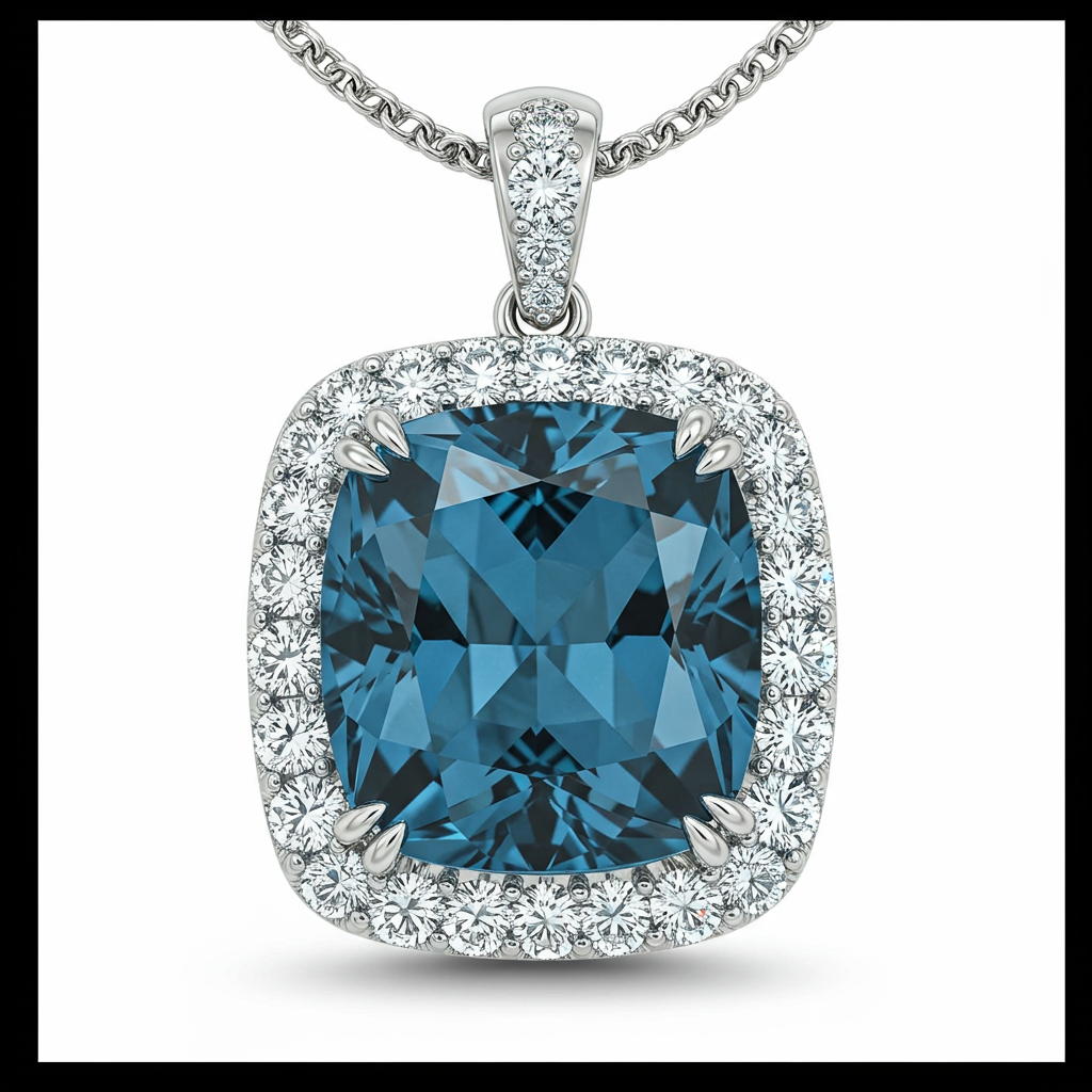 The Titanic Necklace captures the grandeur of eternal romance, centered around a magnificent cushion-cut simulated London Blue Topaz. This breathtaking centerpiece is encircled by a brilliant halo of pavé-set VVS natural diamonds, offering unparalleled fire and brilliance. Crafted in lustrous 18KT white gold, the delicate chain secures this iconic pendant, symbolizing enduring love and luxury. It is an exceptional statement piece destined to become a treasured heirloom.