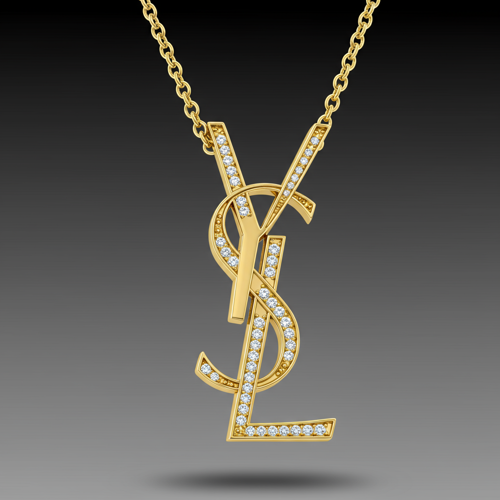 The Ysl Necklace embodies timeless elegance, featuring the iconic interlocking logo rendered meticulously in radiant 18KT gold. This statement piece is expertly pave-set with brilliant VVS round diamonds, creating an unparalleled sparkle that catches the light from every angle. Suspended from a delicate yet durable chain, the pendant rests perfectly at the décolletage. It serves as the ultimate luxurious accent, transitioning seamlessly from sophisticated day wear to evening glamour.