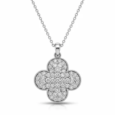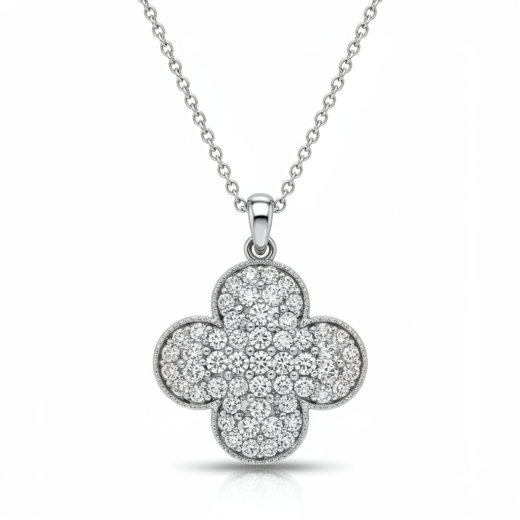 The Alhambra Necklace is an exquisite tribute to classic geometry, featuring a beautifully balanced four-leaf clover motif. This timeless pendant is meticulously set with brilliant VVS G-H round diamonds, creating a continuous halo of light and fire. Crafted in luxurious 18KT white gold, the design hangs elegantly from a fine chain, making it perfect for both daily wear and sophisticated layering. It embodies enduring style and subtle opulence.