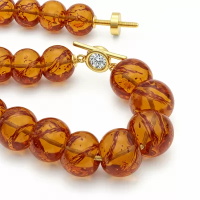 The Amber Teething Necklace merges the timeless, purported healing properties of natural Baltic amber with certified luxury jewelry design. Each polished baroque amber bead is meticulously individually knotted onto a durable silk cord for maximum safety and comfort against accidental breakage. This elegant necklace features a secure 18KT yellow gold safety clasp mechanism, subtly accented with a flawless VVS round brilliant diamond. It offers unparalleled peace of mind through its superior construction, creating a sophisticated and organic heirloom piece for modern families.