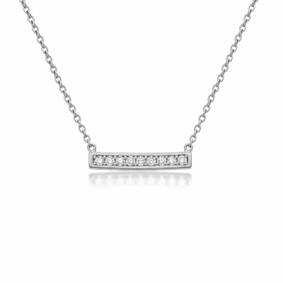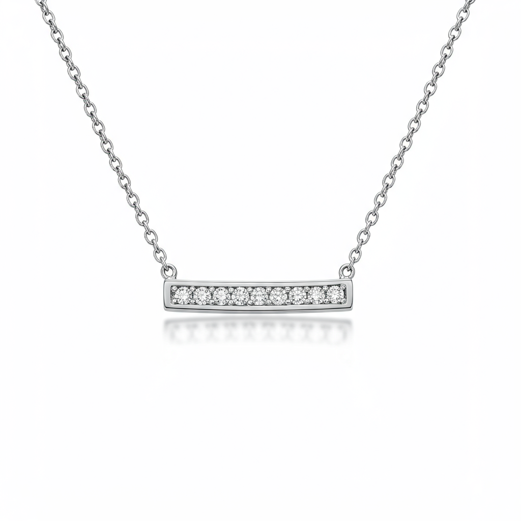 The Bar Necklace embodies minimalist elegance, featuring a sleek horizontal pendant meticulously set with brilliant pave diamonds. Crafted in lustrous 18KT white gold, this piece offers a contemporary yet timeless aesthetic suitable for daily wear or layering. The fine chain and secure closure ensure comfort and durability, making it an essential addition to any modern jewelry collection. Its clean lines symbolize clarity and refined taste.