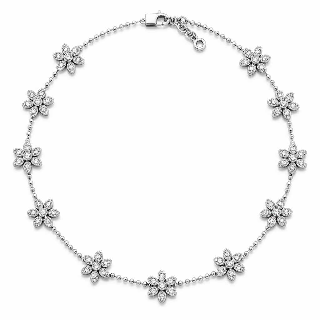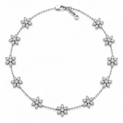 This exquisite Daisy Chain Necklace captures the delicate beauty of springtime flora. Crafted in lustrous 18KT white gold, the fine beaded chain features miniature diamond-set flowers spaced rhythmically along its length. Each tiny daisy motif is intricately detailed, utilizing VVS clarity diamonds to ensure maximum sparkle and fire. This versatile piece serves as a luxurious layering staple or a subtle, elegant statement worn alone, perfect for celebrating enduring grace.