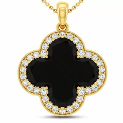 This exquisite Black Van Cleef Necklace features a timeless clover motif meticulously crafted in rich 18KT yellow gold. The iconic central black onyx inlay provides a striking contrast, symbolizing luck and profound elegance. Surrounding the deep black stone, a delicate pave halo of VVS round brilliant diamonds ensures unparalleled sparkle and brilliance. This sophisticated statement piece seamlessly blends classic luxury with modern sensibility, making it a treasured addition to any collection. The necklace chain is perfectly balanced to highlight the pendant’s iconic design.