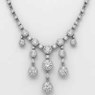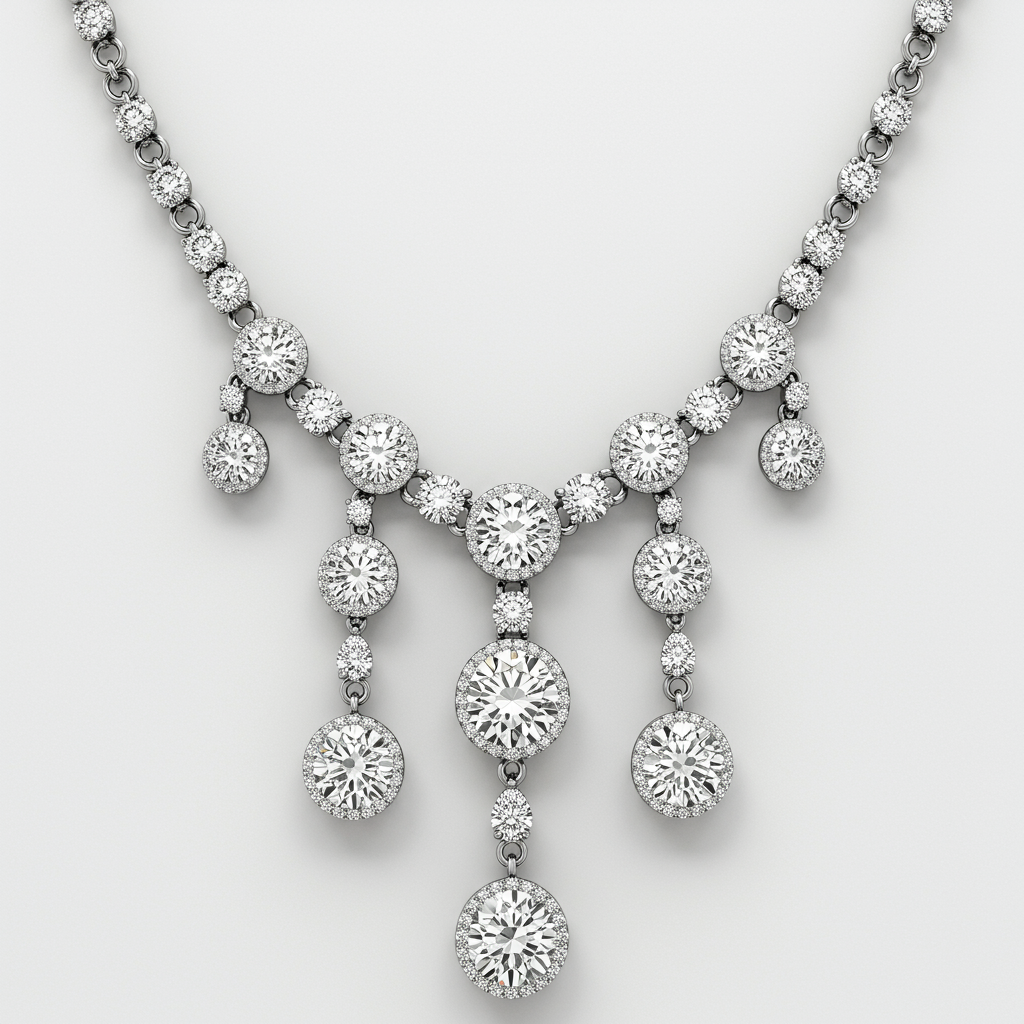 This breathtaking Bridal Necklace epitomizes timeless elegance, crafted in luminous 18KT white gold. Featuring a graceful cascading design, the piece is meticulously set with brilliant-cut diamonds that capture and reflect light from every angle. It serves as the quintessential centerpiece for a wedding ensemble or a grand formal occasion, symbolizing eternal commitment. The intricate craftsmanship ensures both stunning visual impact and comfortable wear throughout the event.