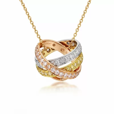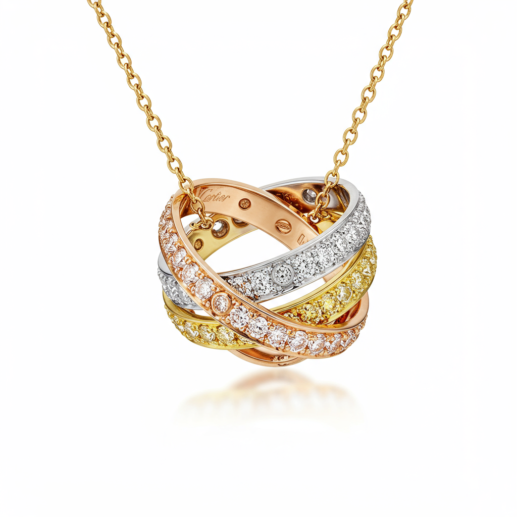 The Cartier Trinity Necklace embodies timeless elegance, featuring three interlocking bands crafted from 18KT white, yellow, and rose gold. This iconic design symbolizes lasting relationships, merging fidelity, friendship, and eternal love. The pendant is subtly enhanced with micro-pave set VVS diamonds, adding a delicate sparkle to the movement of the circles. Suspended on a fine adjustable gold chain, this piece is a masterpiece of modern luxury and heritage design.