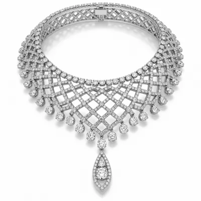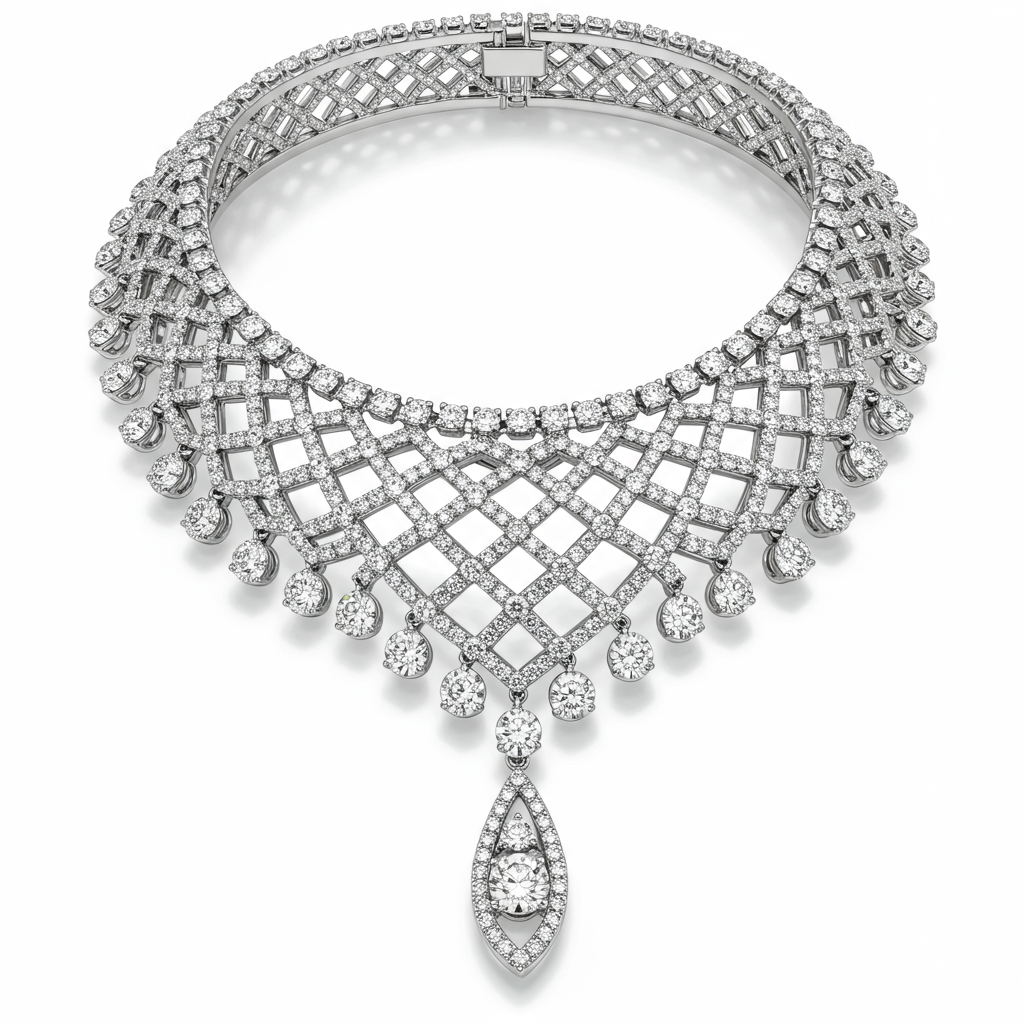 The Collar With Necklace is a masterpiece of modern haute joaillerie, designed to frame the neckline with architectural precision. Crafted in flawless 18KT white gold, the structured collar is entirely enveloped in micro-pave set VVS diamonds, creating a continuous band of light. A singular, brilliant-cut diamond drop pendant provides a breathtaking focal point, symbolizing timeless elegance and grandeur. This piece serves as the ultimate statement accessory for the most exclusive occasions.