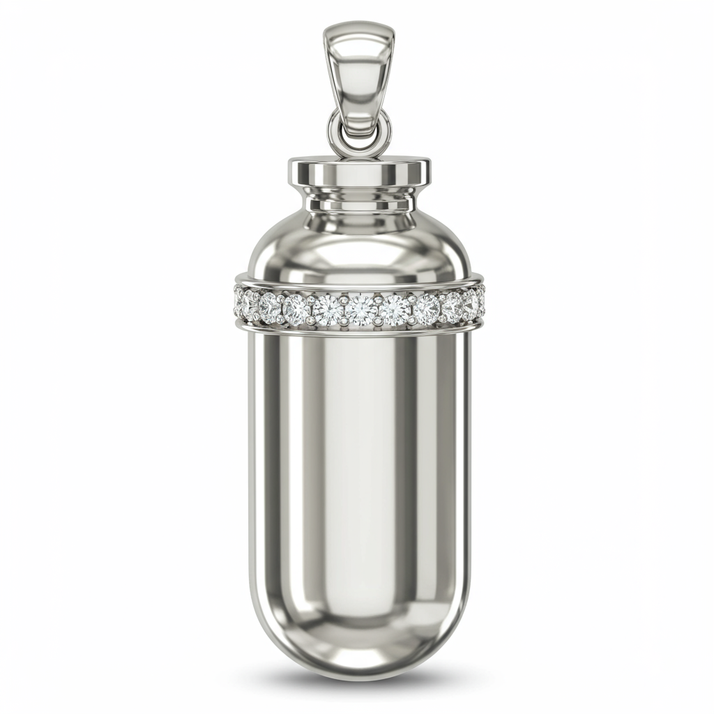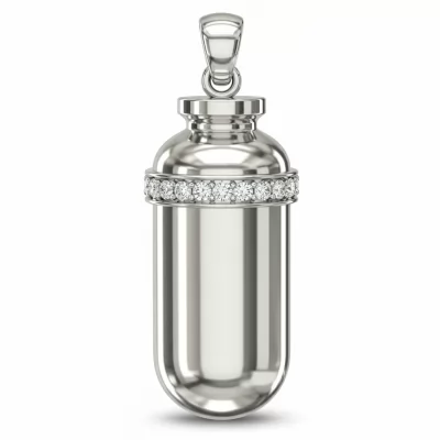This exquisite Cremation Keepsake Necklace provides a deeply personal way to honor cherished memories, combining sentimentality with high-end luxury. Crafted in radiant 18KT white gold, the cylindrical pendant securely houses a small amount of ashes or memento. The top closure is delicately accented with a halo of VVS round brilliant diamonds, adding subtle sparkle and elegance. It serves as a beautiful, enduring tribute designed to be worn close to the heart every day.