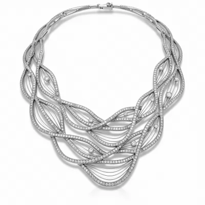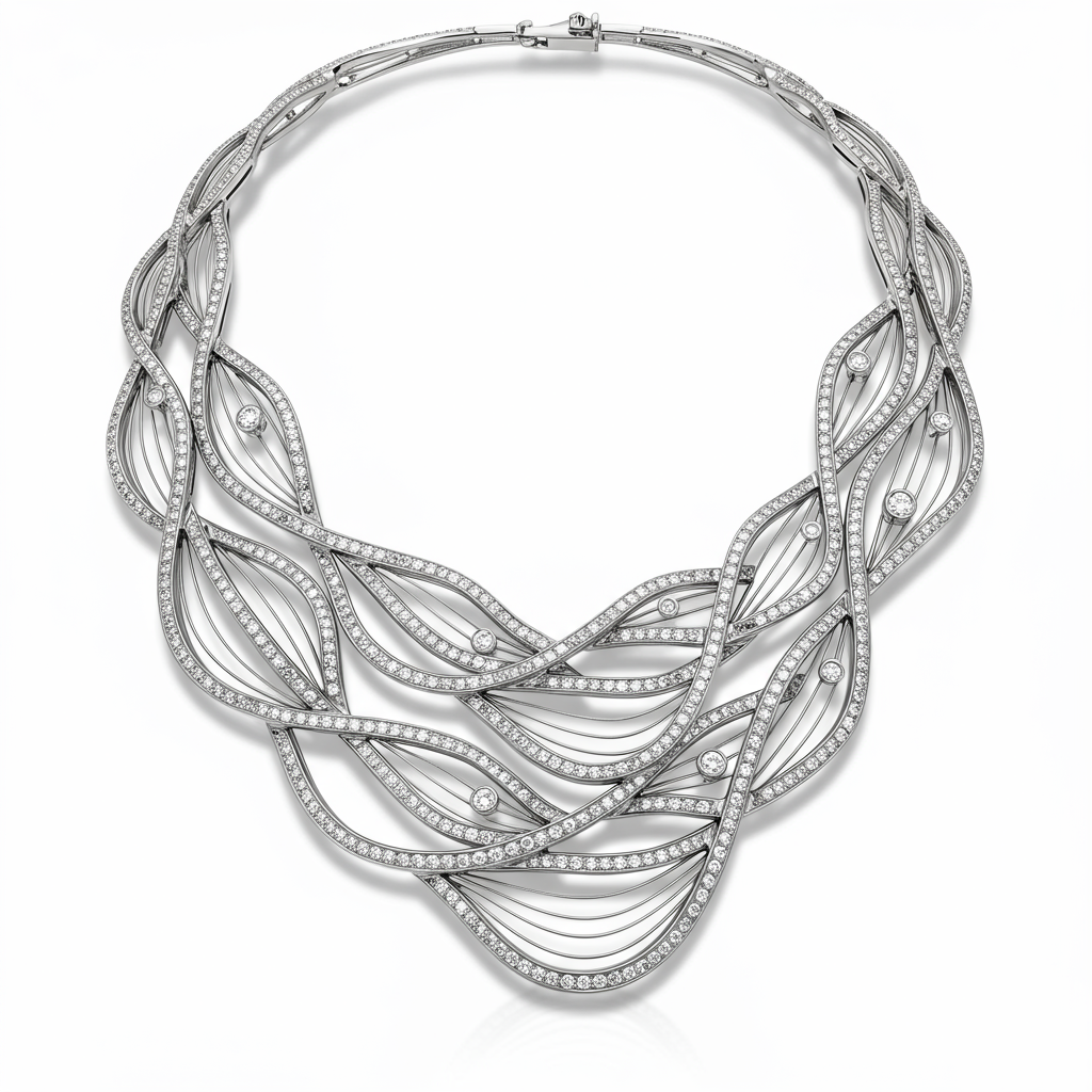 This sophisticated designer necklace captures contemporary elegance through its layered, fluid design. Crafted meticulously in 18KT white gold, the piece features multiple strands adorned with pave-set VVS diamonds, creating an exceptional cascade of brilliance. Its articulated structure and adjustable length ensure versatile styling, making it perfect for both formal events and elevated daily wear. This is a true statement piece designed to turn heads and endure for generations.