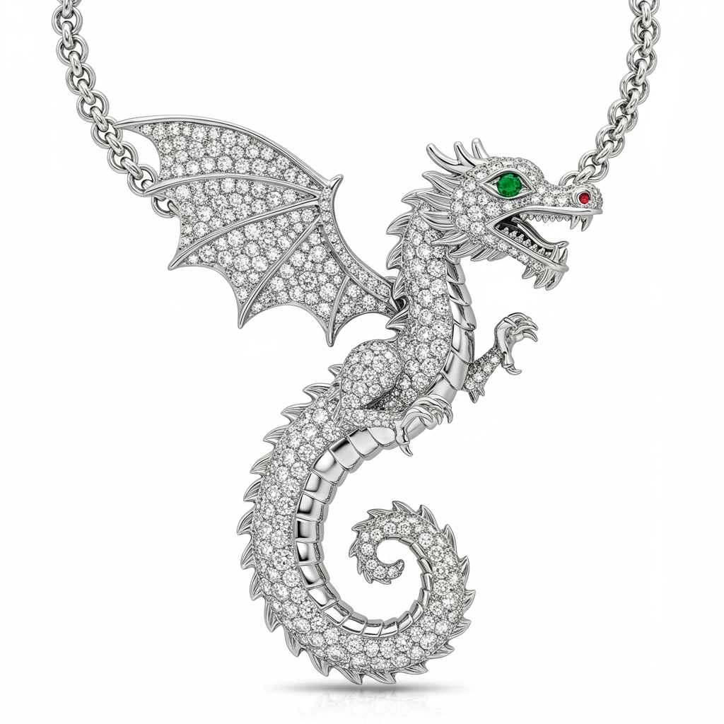 The Dragon Necklace is a masterpiece of mythical elegance, capturing the ferocious beauty of the legendary creature. Crafted in polished 18KT white gold, the articulated dragon design coils powerfully around the chain. Its body is entirely encrusted with micro-pave set VVS G-color diamonds, reflecting light with dramatic brilliance. Emerald eyes provide a striking contrast, symbolizing wisdom and eternal protection. This statement piece is an extraordinary treasure built to become a cherished heirloom.