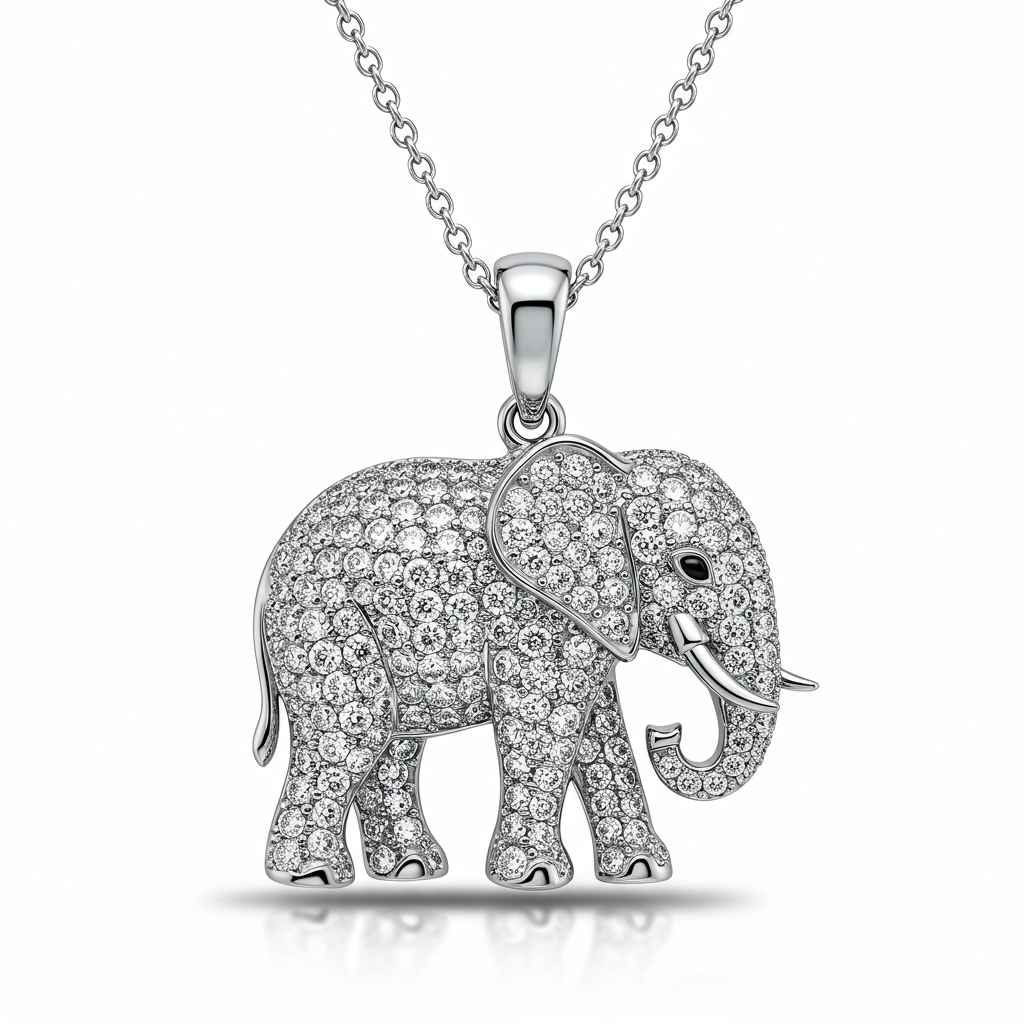 The Elephant Necklace is a timeless symbol of wisdom, luck, and prosperity, meticulously crafted in radiant 18KT white gold. The majestic elephant silhouette is completely adorned with brilliant pave-set diamonds, emphasizing the intricate detailing of its form and trunk. This exquisite piece hangs gracefully from a delicate yet sturdy chain, securing the pendant perfectly at the collarbone. It is designed for the discerning individual who appreciates both fine craftsmanship and deeply symbolic, high-quality jewelry.