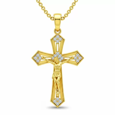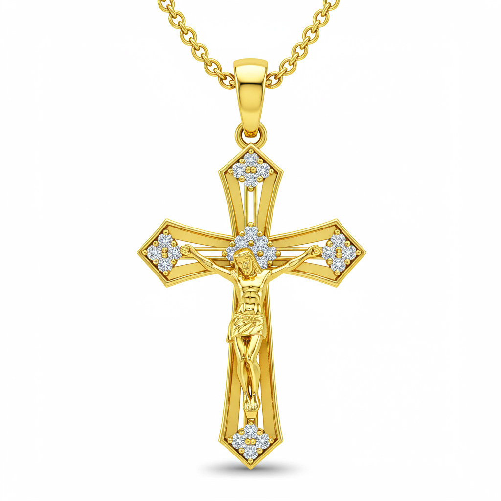 This exquisite Gold Crucifix Necklace is meticulously crafted in radiant 18KT yellow gold, featuring a timeless, detailed cross design. The pendant is fully paved with brilliant VVS clarity diamonds, set to maximize scintillation and light return. Suspended from a delicate, matching gold chain, this piece serves as both a profound symbol of faith and a stunning contemporary accessory. It is an heirloom-quality treasure designed for daily wear or special occasions.