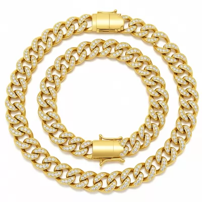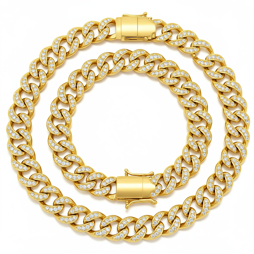 The Gold Necklace Men Cuban Chain embodies ultimate masculine luxury and craftsmanship. Crafted in substantial 18KT yellow gold, its robust links are meticulously set with over four carats of flawless VVS diamonds, creating a continuous line of blinding brilliance. This commanding statement piece is designed for maximum presence, perfect for formal occasions or sophisticated daily wear. It is secured with a seamlessly integrated box clasp, ensuring both security and ergonomic comfort.
