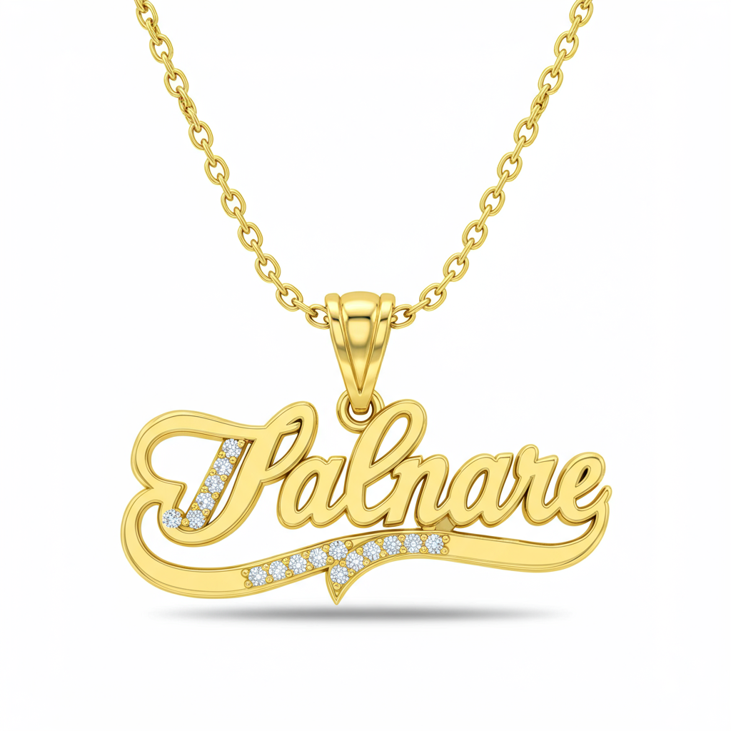 The Gold Name Necklace is the epitome of personalized luxury, crafted in radiant 18KT yellow gold. This bespoke piece features a delicate, perfectly rendered nameplate accented with brilliant, micro-set diamonds. It rests elegantly on a fine link chain, offering a unique blend of modern style and timeless sentimentality. An exceptional heirloom piece, it is designed to hold personal meaning close to the wearer's heart.