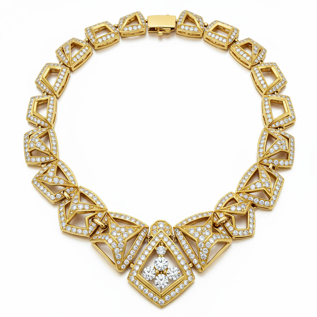 This Gold Statement Necklace is the epitome of luxurious craftsmanship, designed to command attention. Forged in radiant 18KT yellow gold, its architectural structure gracefully drapes the neckline. The intricate design features a mesmerizing flow of pavé-set VVS diamonds totaling 4.50 carats. This piece elevates any formal ensemble, serving as an heirloom-quality treasure destined to shine for generations.