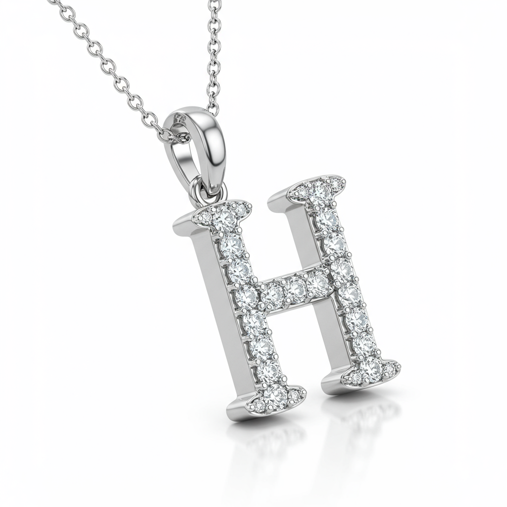This iconic 'H' initial pendant, inspired by celebrity style, captures timeless elegance and modern sophistication. Crafted in brilliant 18KT white gold, the letter is meticulously pave-set with exceptional VVS clarity diamonds that maximize light reflection. Suspended from a delicate yet sturdy chain, this necklace offers a personalized touch of luxury suitable for everyday wear or layering with other pieces. It serves as a striking statement of personal identity and refined taste.
