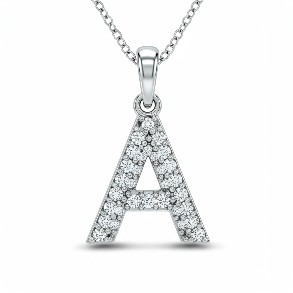 The Initials Necklace is a highly personal statement piece crafted from luxurious 18KT white gold. It features a meticulously detailed initial pendant fully paved with brilliant-cut diamonds, maximizing sparkle and elegance. This heirloom-quality design captures sophisticated style, making it the perfect signature accessory for everyday luxury. The pendant hangs delicately from an adjustable cable chain, ensuring a comfortable and customizable fit for the wearer.