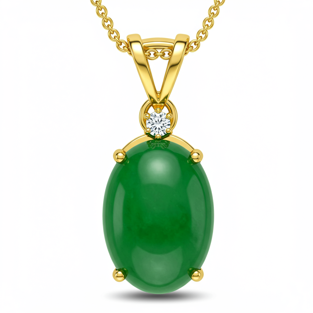 This exquisite Jade Pendant Necklace features a perfectly polished, vibrant green jade centerpiece, symbolizing harmony and protection. The natural stone is cradled within a minimalist 18KT yellow gold bezel setting that beautifully enhances its deep luster. A single brilliant VVS diamond accent sits atop the bail, adding a subtle flash of prestige and luxury. Suspended from a delicate gold chain, this pendant is an elegant heirloom piece destined to be cherished for generations.