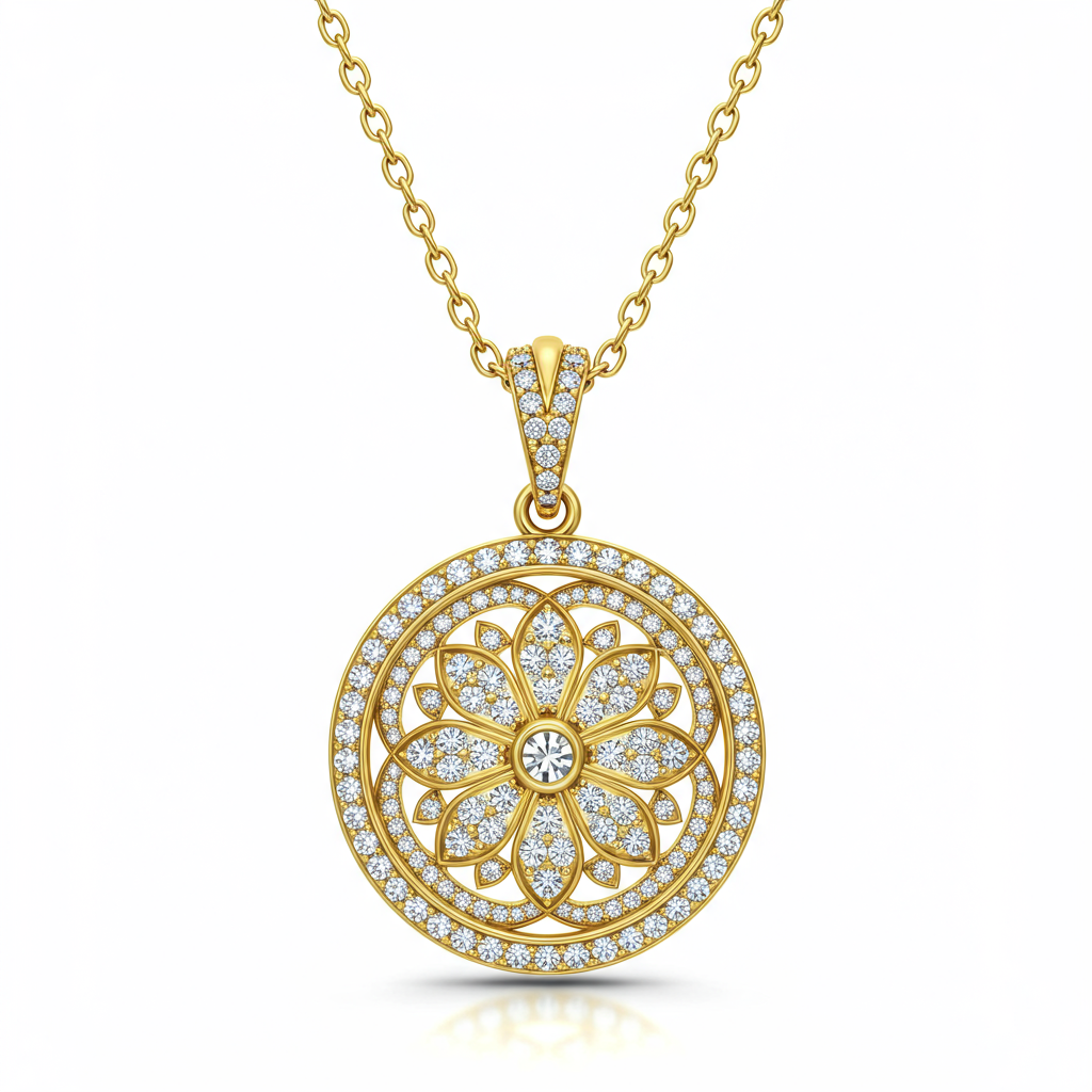 The Jane Win Necklace captures timeless elegance in radiant 18KT yellow gold. This exquisite piece features a central medallion richly adorned with meticulously set VVS diamonds, reflecting unparalleled brilliance and fire. Its classic design ensures remarkable versatility, seamlessly transitioning from sophisticated daywear to glamorous evening ensembles. Expert craftsmanship guarantees lasting quality, making this necklace a cherished heirloom piece that symbolizes enduring luxury.