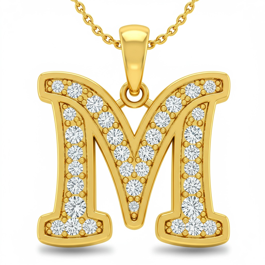 The 'M Necklace' is an exquisite initial pendant, symbolizing personal elegance and timeless style. Crafted meticulously in 18KT yellow gold, the bold letter 'M' is completely blanketed in a brilliant pave setting of high-grade diamonds. This piece offers unparalleled sparkle, catching the light from every angle. It is suspended from a delicate yet sturdy chain, making it perfect for daily wear or layering. A true statement of customized luxury and refined taste.