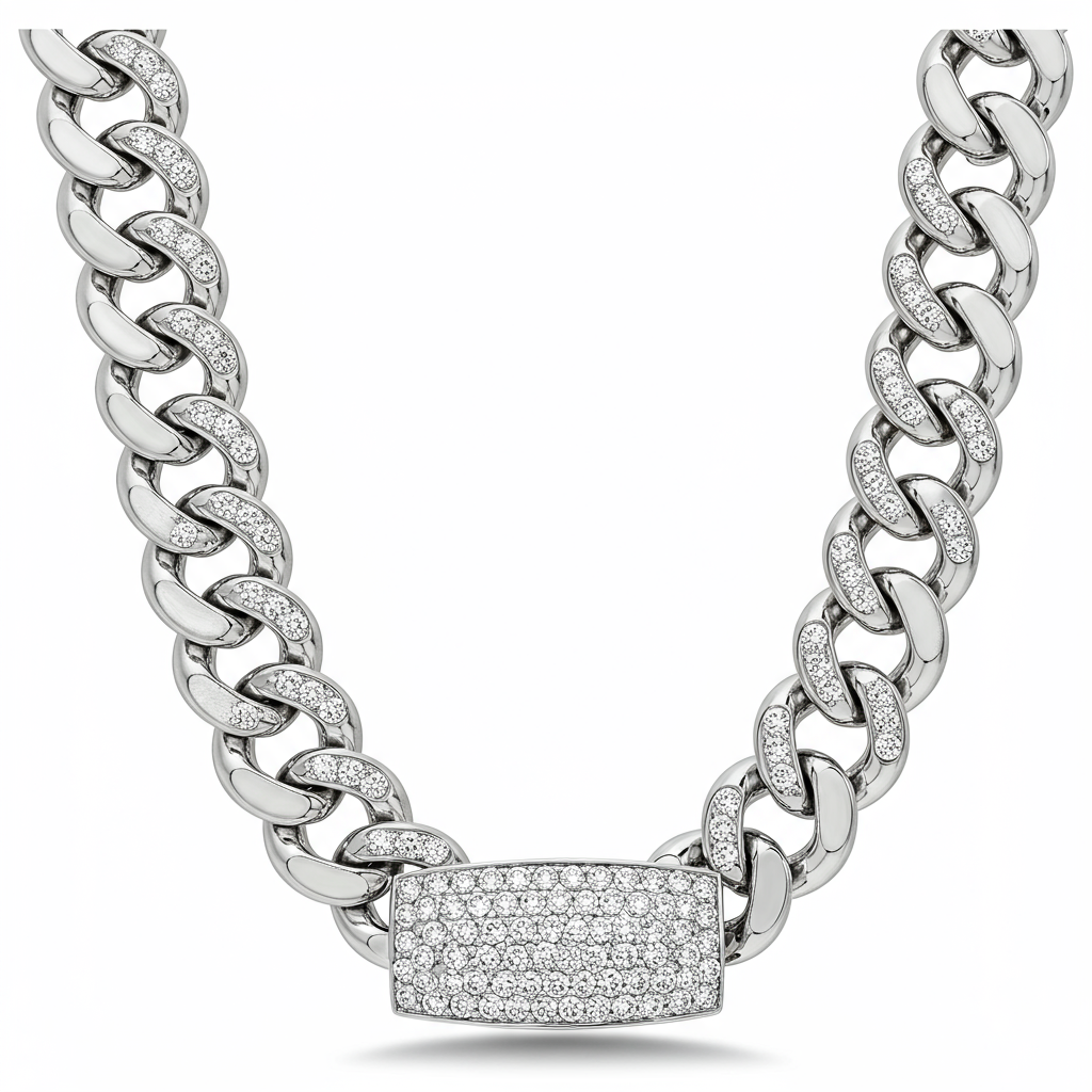 This powerful Men's Necklace epitomizes masculine luxury and modern design. Crafted in substantial 18KT white gold, the robust curb chain features a central segment meticulously set with brilliant natural diamonds. The contrast between the heavy metal and the dazzling stones creates a striking statement piece. It is designed for the discerning gentleman who demands both substance and impeccable style.