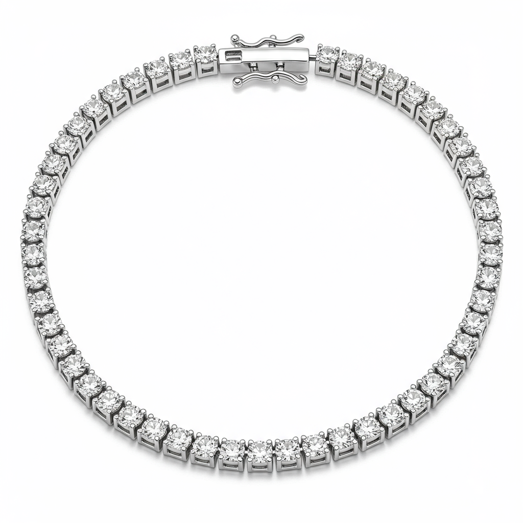 This classic Moissanite Tennis Necklace offers unparalleled brilliance and eternal elegance. Crafted in luxurious 18KT white gold, the continuous line design features meticulously set, uniformly sized round stones that catch the light from every angle. It secures with a sleek hidden box clasp, ensuring both security and a seamless aesthetic flow around the neck. A true statement piece, perfect for formal occasions or sophisticated daily wear.