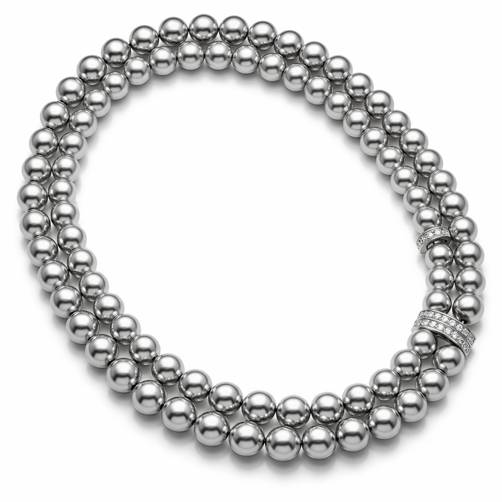 The Navajo Pearl Necklace reimagines traditional Southwestern elegance with modern luxury. This statement piece features highly polished 18KT white gold beads, meticulously graduated in size, offering a smooth, substantial drape around the neck. A delicate accent station, set with brilliant VVS diamonds, adds a subtle sparkle to this timeless design. Its antique inspiration and refined craftsmanship make it an essential heirloom piece for sophisticated collectors.