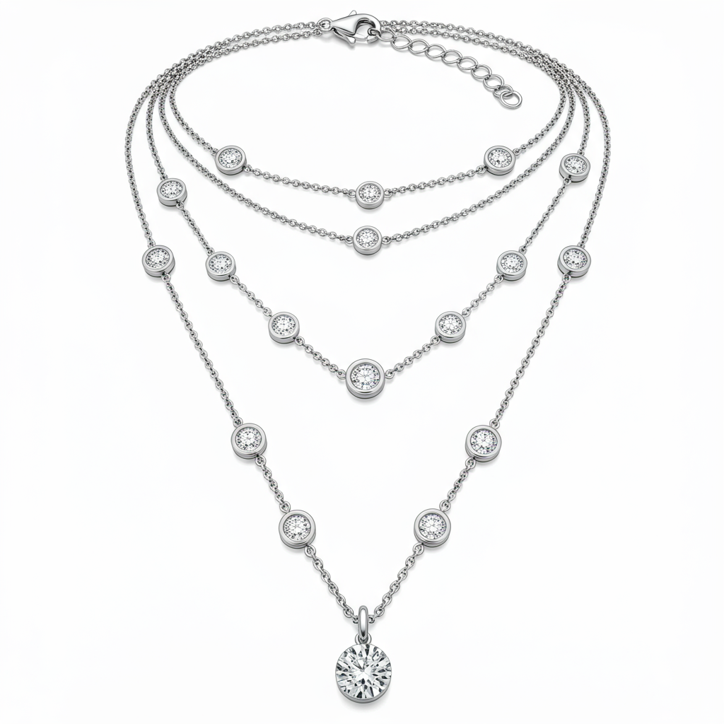 The Necklace Stack offers effortless elegance with three meticulously coordinated layers of brilliance. Crafted in lustrous 18KT white gold, this set includes a delicate diamond choker, a station necklace featuring scattered bezel-set diamonds, and a classic diamond solitaire drop. This versatile stack provides a complete, modern look, designed to catch light from every angle. It represents the pinnacle of contemporary luxury and sophisticated layering.