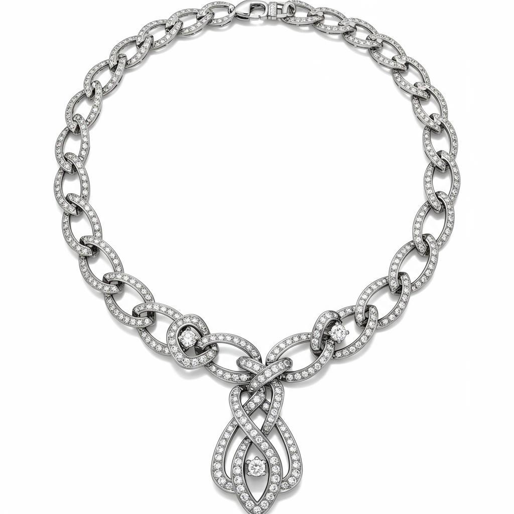 The Omega Necklace is a masterpiece of modern luxury, featuring a gracefully articulated link design crafted in lustrous 18KT white gold. This striking piece showcases 3.50 carats of meticulously set round brilliant diamonds, creating an unparalleled cascade of light and brilliance. Its ergonomic construction ensures both comfort and spectacular visual impact, making it the definitive choice for sophisticated formal occasions. This statement necklace symbolizes eternal sophistication and exceptional craftsmanship, defining modern high jewelry standards.