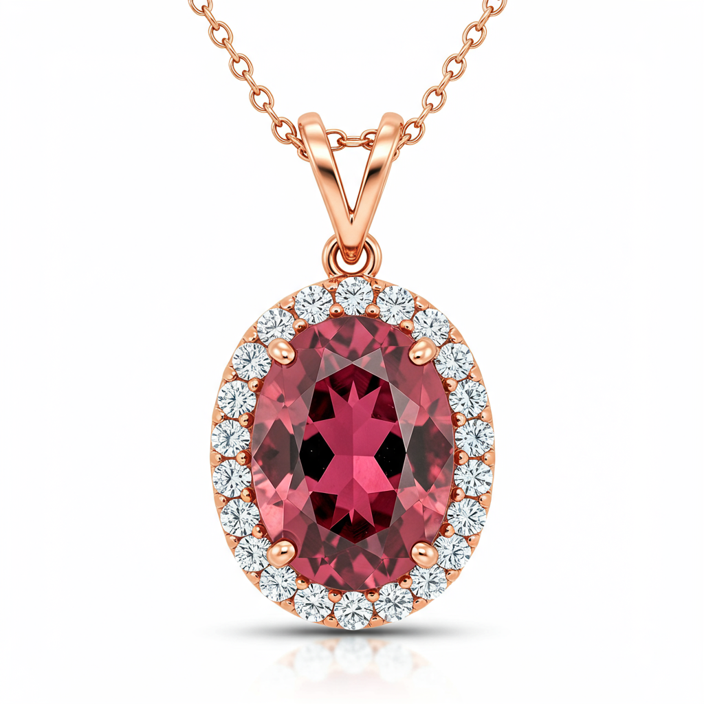 The Pink Necklace captures the essence of sophisticated femininity with its vibrant central gemstone. Featuring a magnificent 1.50 carat oval Pink Tourmaline, this piece is surrounded by a brilliant halo of VVS round diamonds. Set delicately in luxurious 18KT Rose Gold, the contrast enhances the stone's deep hue and fire. This pendant hangs from a finely crafted chain, offering a look of timeless elegance and modern grace. It is the perfect signature piece for any elevated occasion.
